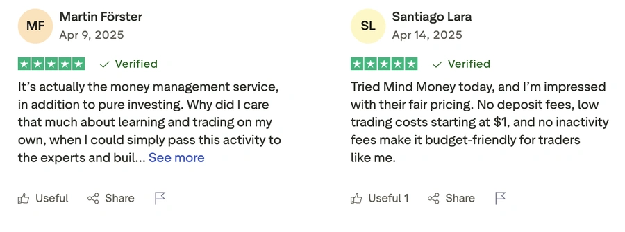 Жан Мюллер, Франция — он пишет, что комиссии Mind Money нельзя назвать самыми низкими на рынке, но их честное и подробное описание позволяет ему заранее планировать расходы по сделкам.